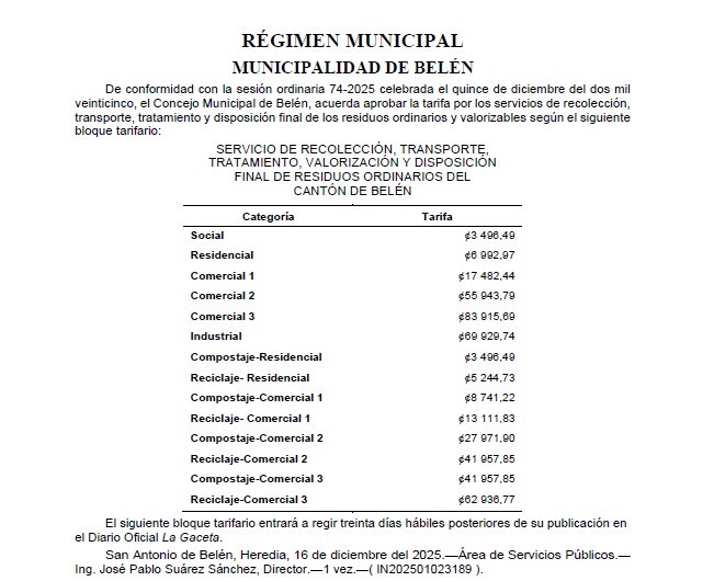 De conformidad con la Sesión Ordinaria del Concejo Municipal N°74-2025 y la Publicación en el Alcance N°164 a la Gaceta N°239 del 19 de diciembre del 2025, se indican las tarifas vigentes a partir del 13 de febrero del 2026